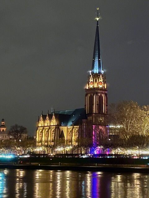 One of my favorite moments here was sipping Glühwein while looking across the river at the Three Kings Church (Dreikönigskirche). At night, the church is all lit up, reflecting off the water like something out of a painting.
