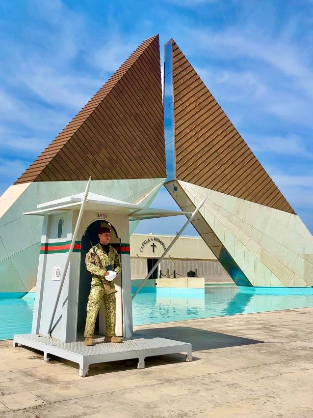 At the center is a flame-shaped sculpture rising from a shallow water pool. Along the back wall, you’ll see the entrance to a small chapel, and I definitely recommend going inside. There’s a narrow hallway in the back that leads to the memorial tomb, a quiet, moving space that’s easy to miss if you don’t know it’s there.